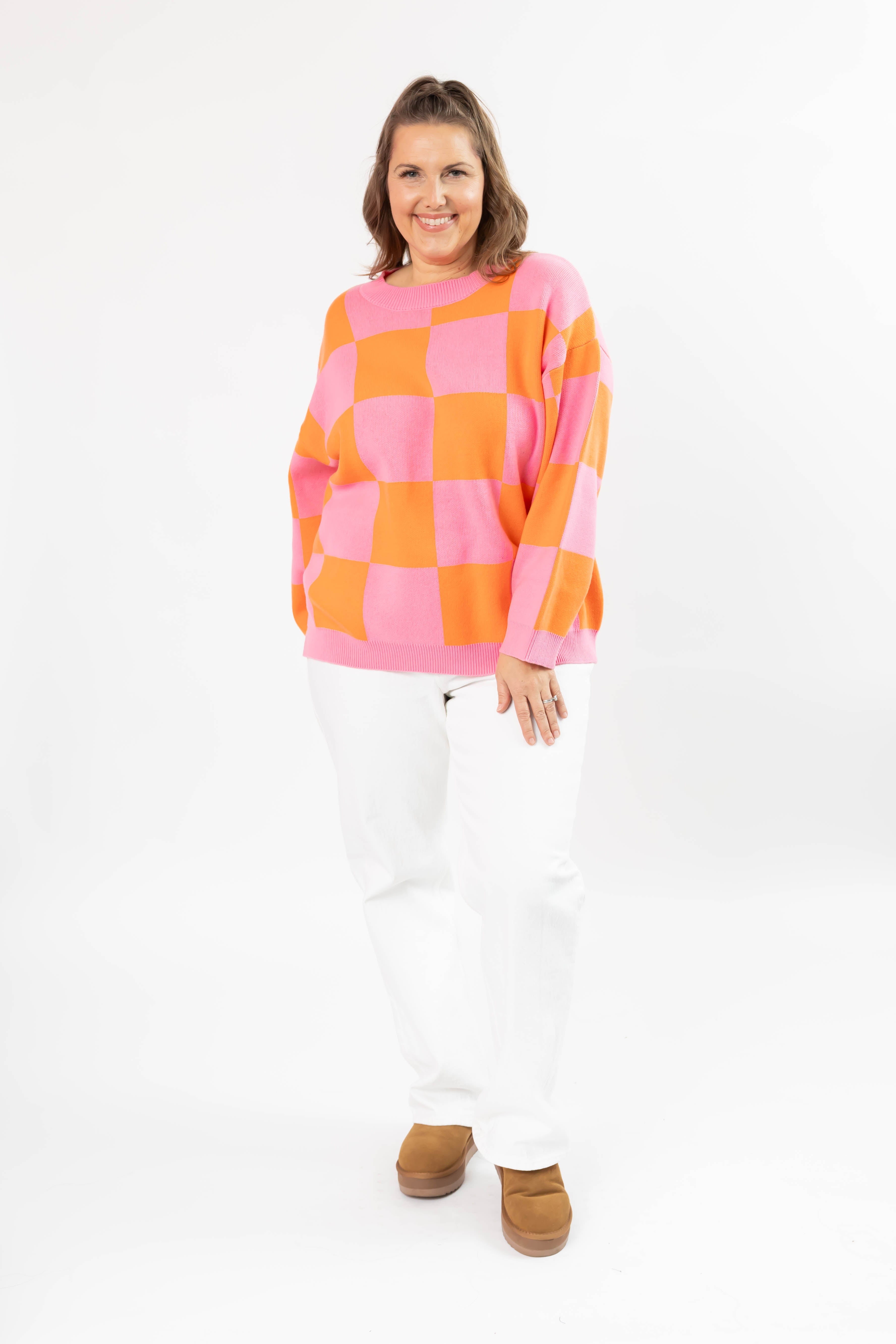 - Chrissy Checkered Sweater in Pink/Orange Chrissy Checkered Sweater in Pink/Orange