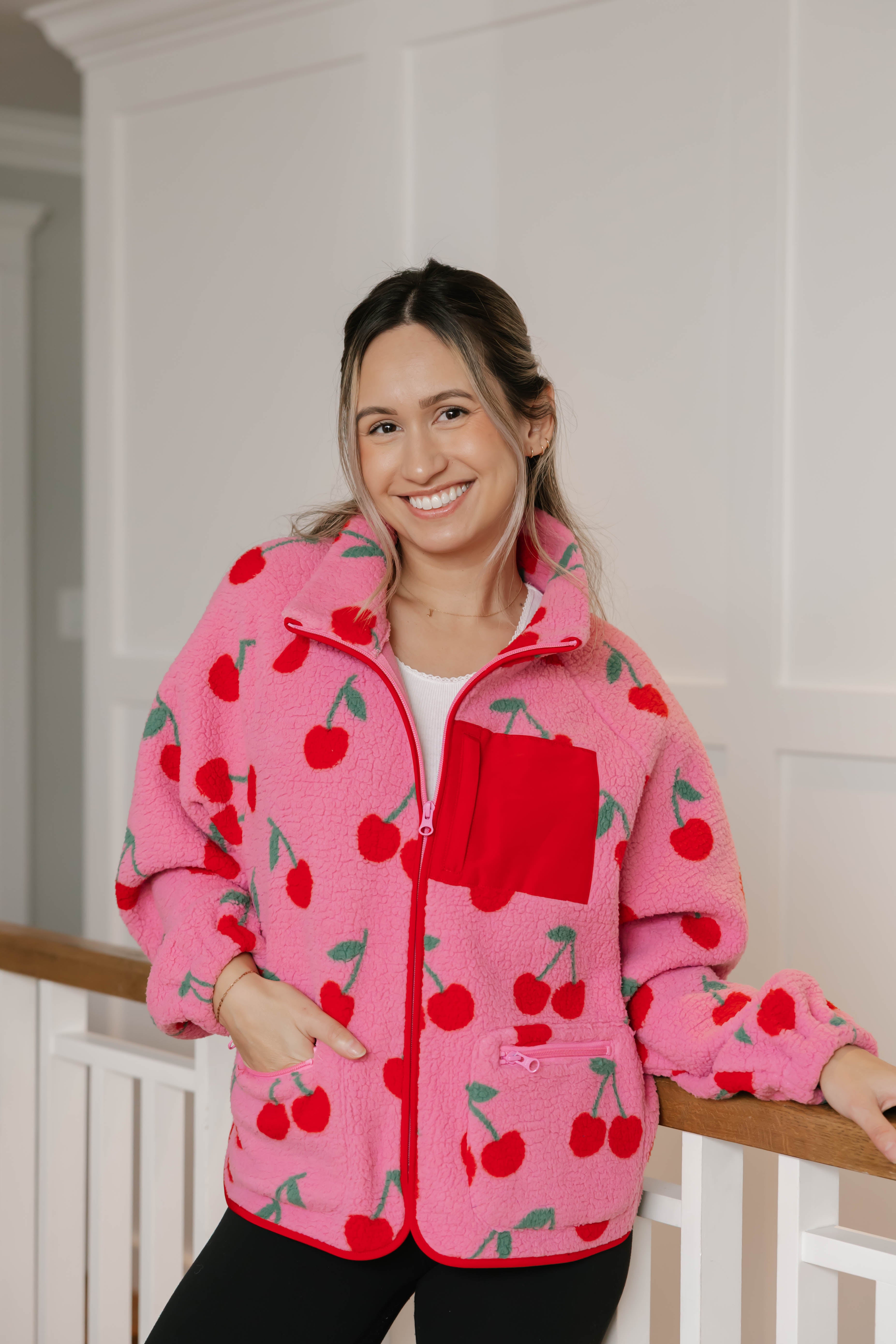 - Teddy Zip Up Jacket in Pink/Red Cherry Teddy Zip Up Jacket in Pink/Red Cherry