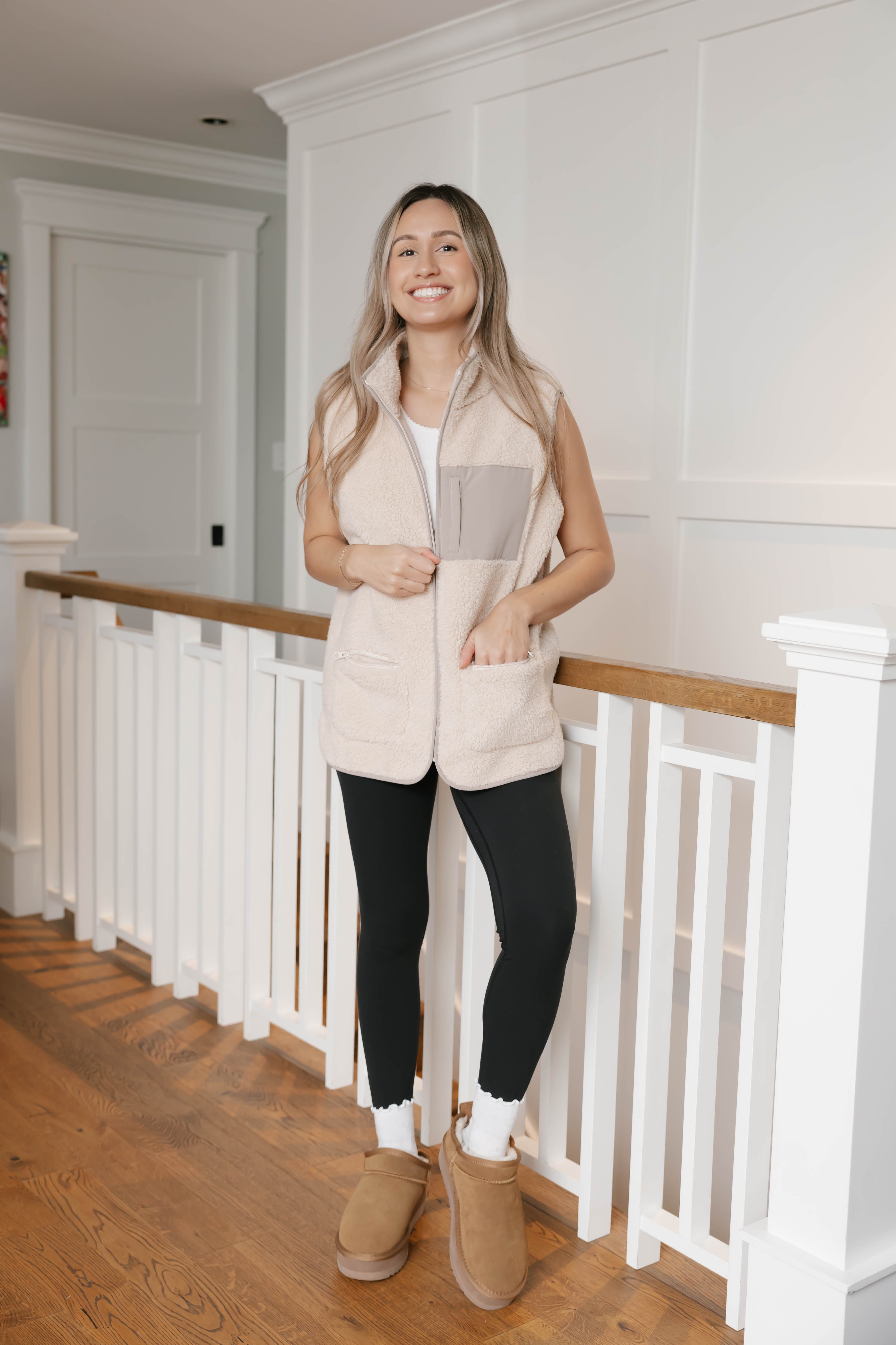 The cherry on top of any outfit! Made from a 100% recycled bonded teddy teddy, this adorable vest will keep you feeling cozy + on-trend! Featuring a mock neck, front zipper, patch + chest pockets, the Teddy Vest has everything you need to stay warm this season while looking oh-so-cute!